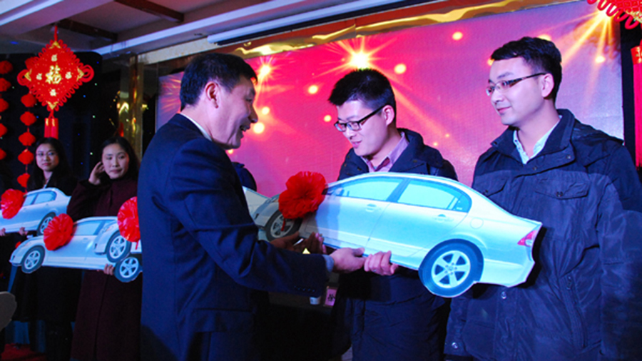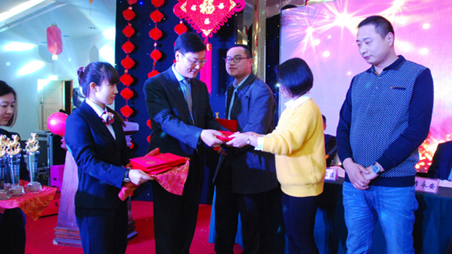 年會由總結報告、表彰慶功、文藝演出、酒會活動等環(huán)節(jié)組成。年會現(xiàn)場,氣氛激情、熱烈、活躍。陳學民總經(jīng)理首先總結回顧了德源藥業(yè)2014年度的各項工作。徐金官副書記宣讀了公司2014年度優(yōu)秀員工的表彰決定,鄭家通副總經(jīng)理對每位受表彰的員工先進事跡作了介紹。李永安董事長親自向2014年度業(yè)績突出的6個辦事處頒發(fā)了轎車模型,陳學民總經(jīng)理、范世忠副總經(jīng)理、徐金官副書記分別為楊海云等12名優(yōu)秀員工、3名優(yōu)秀管理者、2名銷售標兵、4名銷售能手、2名銷售進步者、1名生產(chǎn)操作能手、1名科技先進工作者、1名質(zhì)量管理先進工作者和2名安全先進工作者頒發(fā)了獎杯和證書,優(yōu)秀員工代表楊海云、董超、李靜、宋明明分別上臺發(fā)表了獲獎感言。