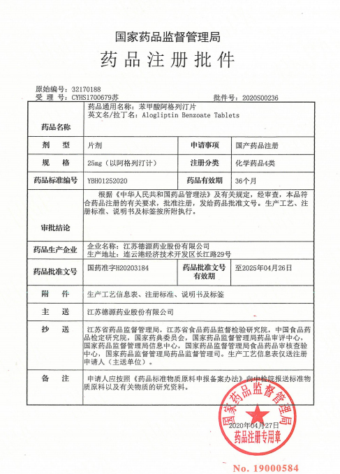 苯甲酸阿格列汀片為二肽基肽酶-4(DPP-4)抑制劑,用于治療2型糖尿病。通過(guò)抑制DPP-4活性,減慢腸降血糖素的滅活,并以葡萄糖依賴性方式降低2型糖尿病患者的空腹和餐后血糖。與其他降糖尿藥相比,DPP-4抑制劑胃腸道不良反應(yīng)少,低血糖風(fēng)險(xiǎn)較低,且不增加體重。該藥由日本武田藥品工業(yè)株式會(huì)社研發(fā),2010年6月在日本上市 ,2013年7月進(jìn)入中國(guó)市場(chǎng)。公司是國(guó)內(nèi)第三家獲得苯甲酸阿格列汀片仿制批件的企業(yè)。目前笨甲酸阿格列汀片已被納入2019版國(guó)家醫(yī)保目錄(乙類)。