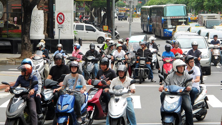 臺灣人更喜歡機車,方便,低排放,注意無一例外,全部戴頭盔。