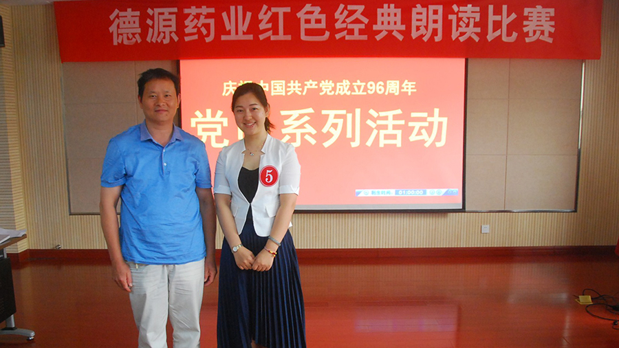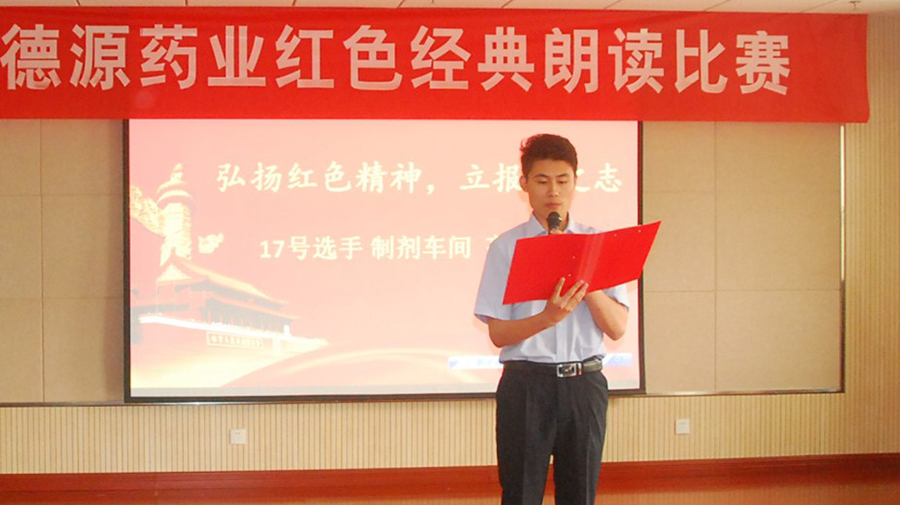 6月28日下午,“德源藥業(yè)紅色經(jīng)典朗讀比賽”在公司會(huì)議室成功舉行。來自固體制劑車間、質(zhì)量部、制造部、研究所、市場(chǎng)部、業(yè)務(wù)部等部門共計(jì)33名選手參加比賽。比賽邀請(qǐng)市委宣傳部孫宜志處長、恒瑞醫(yī)藥工會(huì)主席趙霞、中金瑪泰工會(huì)主席笪瑩、公司黨委副書記徐金官、公司人力資源行政總監(jiān)薛四明擔(dān)任評(píng)委。