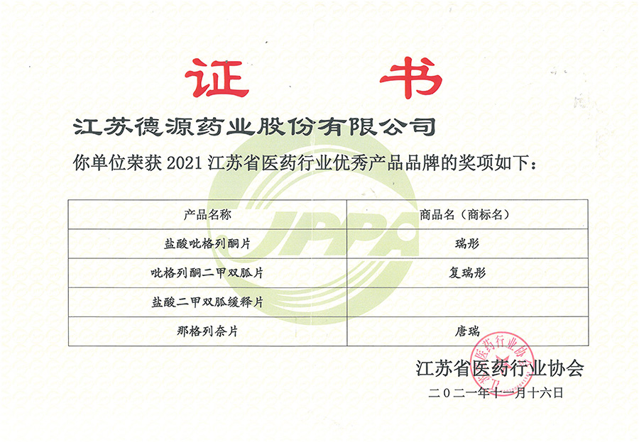 近日,江蘇省醫(yī)藥行業(yè)協(xié)會(huì)為大力推進(jìn)全省醫(yī)藥行業(yè)品牌建設(shè),提升產(chǎn)品競(jìng)爭(zhēng)優(yōu)勢(shì),推進(jìn)江蘇省醫(yī)藥品牌發(fā)展戰(zhàn)略,對(duì)外發(fā)布了“2021江蘇省醫(yī)藥行業(yè)優(yōu)秀產(chǎn)品品牌”。我公司鹽酸吡格列酮片(瑞彤?)、吡格列酮二甲雙胍片(復(fù)瑞彤?)、鹽酸二甲雙胍緩釋片(德源?)、那格列奈片(唐瑞?)等4個(gè)品種位列其中,獲得省醫(yī)藥行業(yè)優(yōu)秀產(chǎn)品品牌證書(shū),這4個(gè)產(chǎn)品已連續(xù)三年獲得該榮譽(yù)。