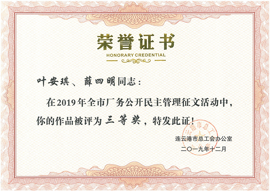 近日,市總工會為在2019年全市廠務(wù)公開民主管理征文活動中的獲獎作品頒發(fā)證書,我公司葉安琪、薛四明以公司開展廠務(wù)公開民主管理工作為實(shí)例撰寫的《民主管理是凝聚職工構(gòu)建和諧企業(yè)的重要途徑》被評為三等獎。