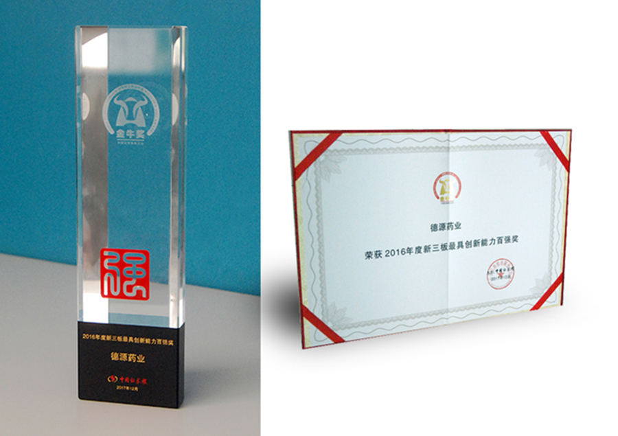 由中國(guó)證券報(bào)組織評(píng)選的“2016年度新三板金牛獎(jiǎng)”新鮮出爐,200家新三板掛牌公司獲評(píng)2016年度新三板金牛獎(jiǎng)。本次獎(jiǎng)項(xiàng)共設(shè)置“新三板最具價(jià)值投資百?gòu)?qiáng)獎(jiǎng)”和“新三板最具創(chuàng)新能力百?gòu)?qiáng)獎(jiǎng)”,每個(gè)獎(jiǎng)項(xiàng)各評(píng)出100家公司。德源藥業(yè)位列于新三板最具創(chuàng)新力100強(qiáng)企業(yè)榜單。