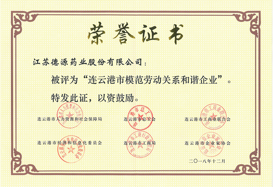 長期以來,德源藥業(yè)堅持以勞動關(guān)系長期和諧穩(wěn)定為目標,誠實守信,依法經(jīng)營,深入開展和諧勞動關(guān)系創(chuàng)建活動,切實維護職工的合法權(quán)益,實現(xiàn)了企業(yè)與職工的共同發(fā)展與成長,獲得了上級主管部門的多次表彰。自2012年我市開展這項活動,公司已連續(xù)7年獲得此項榮譽,并已于2014年獲得省模范勞動關(guān)系和諧企業(yè)榮譽稱號。
