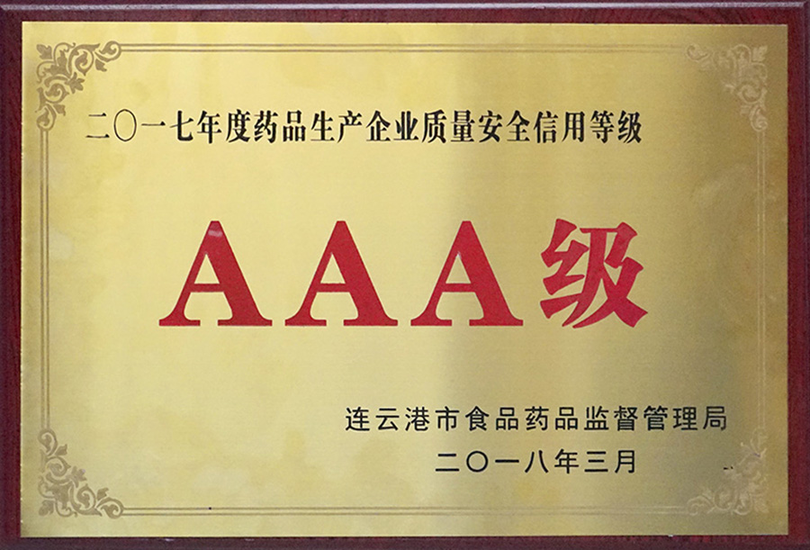 4月3日,市食藥監(jiān)局召開2018年全市藥品生產(chǎn)監(jiān)管工作會議,會上宣布了2017年度連云港市藥品生產(chǎn)企業(yè)質(zhì)量安全信用等級評定結(jié)果,我公司被評定為藥品生產(chǎn)企業(yè)質(zhì)量安全信用等級AAA級。公司已連續(xù)三年,累計(jì)第5次獲此殊榮。