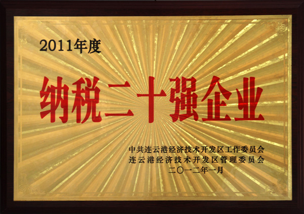 近日,在連云港經(jīng)濟技術開發(fā)區(qū)召開的2011年總結表彰暨2012年工作動員大會上,我公司又一次進入開發(fā)區(qū)工業(yè)納稅20強企業(yè)行列,再次獲得“2011年度納稅二十強企業(yè)”榮譽稱號。